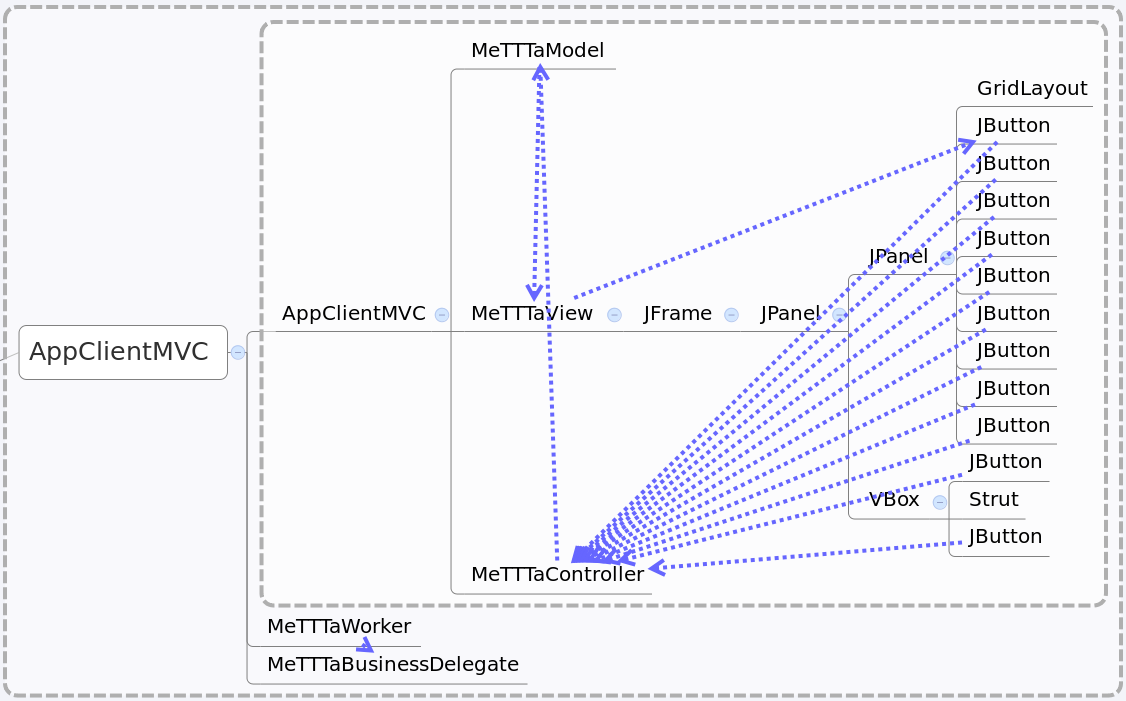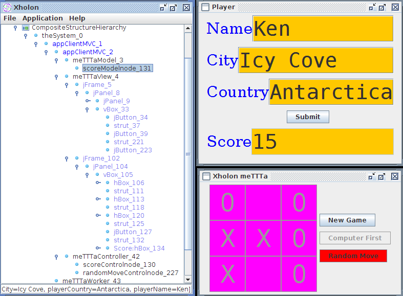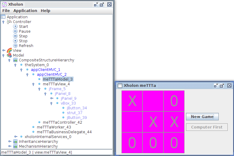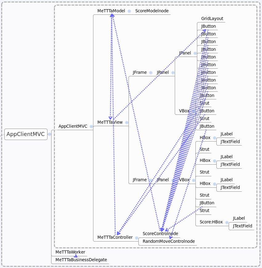 A Xholon app can export its composite structure to FreeMind (.mm) mind-mapping format. XMind can read that format, and does a good job of showing the containment structure of the Xholon nodes and the port connections between nodes. XMind produced the following before and after diagrams by reading and displaying the unedited FreeMind .mm file. The blue arrows in each diagram show the wiring changes. For example, it's easy to see that the nine buttons in the GridLayout have been rewired to reference the new ScoreControlnode rather than the original MeTTTaController.
