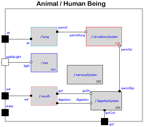 My body includes many different systems including Lungs for breathing, Eyes for seeing, a Mouth for eating, and a Digestive System for digesting the food. I have a Circulatory System for moving the breathed air and digested food to where it's needed, and a Nervous System to convert sensory images from the Eyes and other sensors into actions by Muscles within the Mouth and other parts of the body.